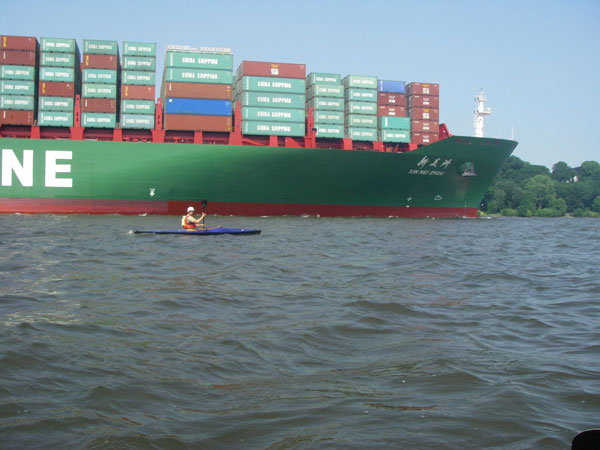 Auf der Unterelbe: Ein ganz Großer und ein ganz Kleiner.