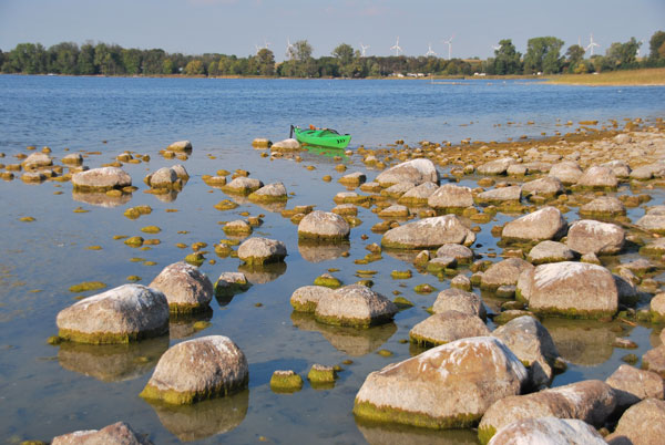 Normalerweise steht ein Meter Wasser über den Steinen; in diesem Sommer lag der Rücken, den das Eis aufschob, als es hier einmal zum Stillstand kam, trocken. Vorsichtig setzte ich den Prijon Calabria zwischen die Blöcke. Kein Wunder, daß Fontane glaubte, hier hätten die Mönche des Mittelalters einen Damm durch den See geschüttet. Wenn der Pegel wieder auf Normalhöhe steht, wird es viele Jahre dauern, bis man wieder zu Fuß über das Riff gehen kann.