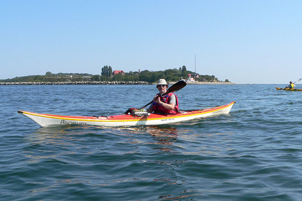 Seekajaks vor der Greifswalder Oie - im Rahmen des Peenemünder Seekajaktreffens paddelten wir 2005 von Usedom aus in die Pommersche Bucht. Auf der Oie konnten wir den sonst unzugänglichen Leuchtturm besteigen.