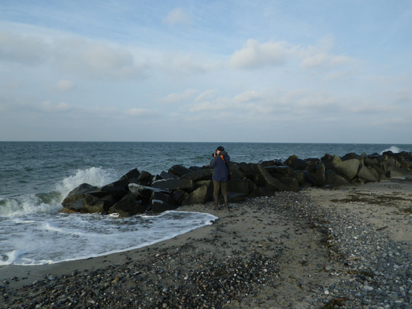 Hiddensee im Januar 2015. Temperatur um den Gefrierpunkt, die Sonne hatte an diesem Tag nur zwei Stunden Zeit, ihre Aktivität auf der Oberfläche zu zeigen, der Wind bläst mit Stärke 4 und treibt die Welle an den Küstenschutz. Ein Fotograf versucht die Gischt mit Silizium einzufangen....