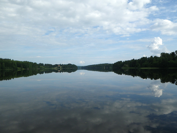 Juli 2011 in Nordmarken: Der Tag begann mit absoluter Windstille und angenehmen Temperaturen, der Töck lag ruhig zwischen den bewaldeten Felsen.