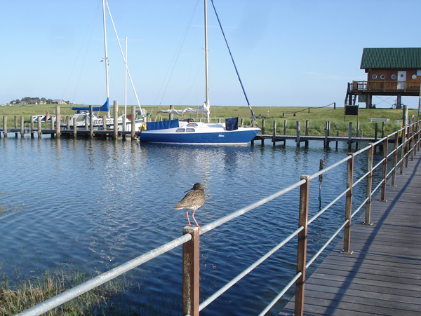 Junger Ureinwohner wacht im Hafen vom Hallig Segel Club Hooge bei Hoch-Wasser am 4. Juli 2010.