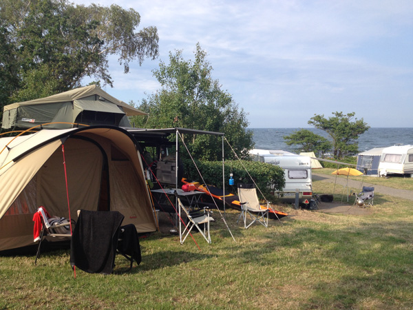 Unser „Set up“ mit Langboot auf dem empfehlenswerten Bornholmer Campingplatz Sannes Familiecamping.