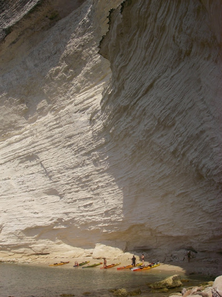 Schwimmpause an einem kleinen Strand mit überhängendem Kreidefelsen zwischen dem Cap de Pertusato und Bonifacio.