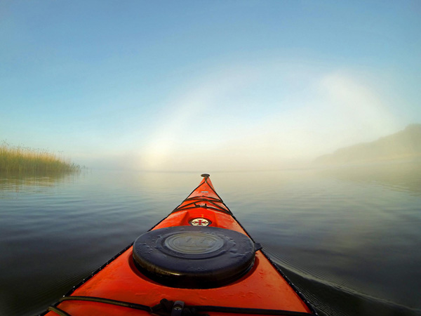 Ausfahrt aus dem Hafen Seedorf. Die aufgehende Sonne im Rücken und Nebel voraus ließen einen schönen Nebelbogen entstehen.