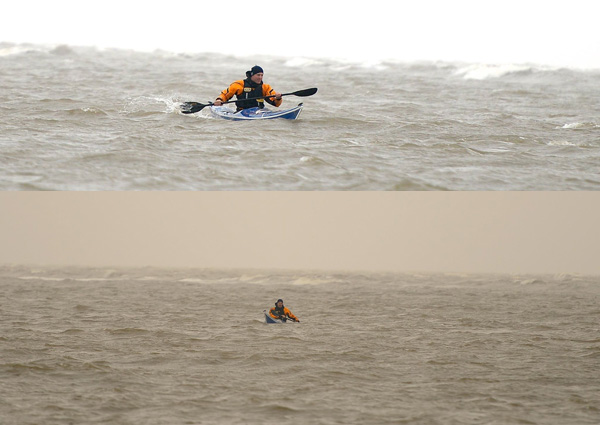 Neujahrspaddeln bei Grismby (England). Die englische Ostküste kann zwar nicht mit Schottland oder der Atlantikküste im Westen mithalten, bietet aber gerade mit frischer Brise schöne Wellen zum Surfen auf. In Kombination mit recht starken Strömungen mit bis zu 4kn teilweise ein anspruchsvolles Revier.