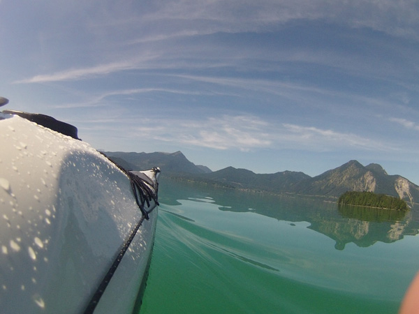 Der Walchensee ist ein beliebter Hotspot der Surfer. Gegen Mittag pfeift der Thermikwind zwischen dem Herzogstand und dem Jochberg hinab auf den See. An diesem schönen, warmen Augusttag fiel der Wind aus. Schwimmer sind selten. Das Wasser ist immer kalt. Ich war allein auf dem See.