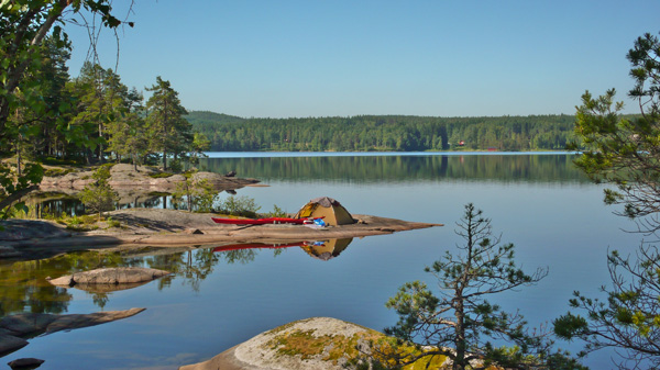 Auf dem Västra Silen im schwedischen Dalsland, gegenüber Varvik. In den steinigen Buchten ist ein selbstragendes Zelt sehr hilfreich. Auf dem Fels gegenüber die Silhouette eines Bären