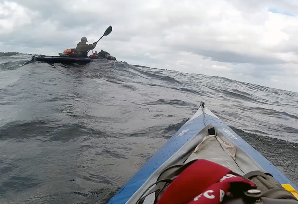 Am dritten Tag unserer Umfahrung des Dalsbosjön, dem Westteil des Vänern, drehte der Wind auf und wir paddelten stundenlang mit hohem Seegang und starkem Seitenwind vom Tösse Skärgard zur Fyllingarna. Hier befinden wir uns zirka vier Kilometer südöstlich von Amal. Das Foto zeigt Roland mit seinem Aerius.